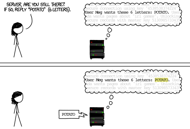 Say I am the attacker trying to attack a banking application called Foo.com. This banking application, Foo is using our buggy OpenSSL library for encrypting all the information exchanged with its users. I login to Foo, so internally all the probable networking formalities such as the TCP 3-way handshake, symmetric private key exchange etc has been completed and a connection has been setup between me and Foo's server. In order to keep this connection alive, a heartbeat extension service is running in the background. My machine would send a data or payload and the length of my payload to Foo's server. The Foo server running the OpenSSL library (written in C) receives my payload and length. The heartbeat service will find the payload I sent from its memory and send back data equal to the length I sent as shown in the image. I sent my payload 'POTATO' and its length '6'. The server finds 'POTATO' stored in its memory and sends back 6 letters.